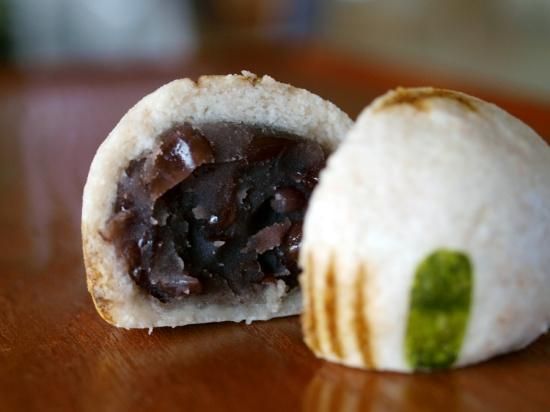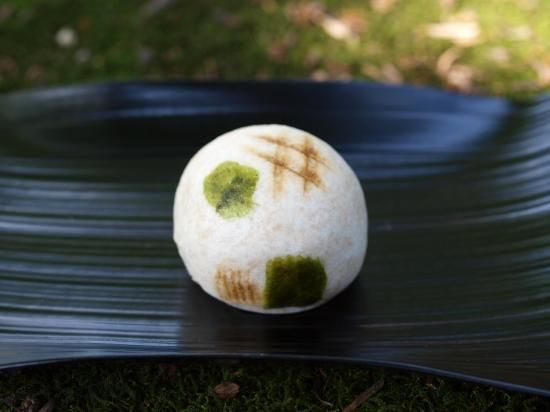 炉開きに使われる織部焼のように、薯蕷饅頭の生地をひなびた土色かかった色にして緑を付け 井桁(いげた)模様を焼印で押しました。粒あん入り。